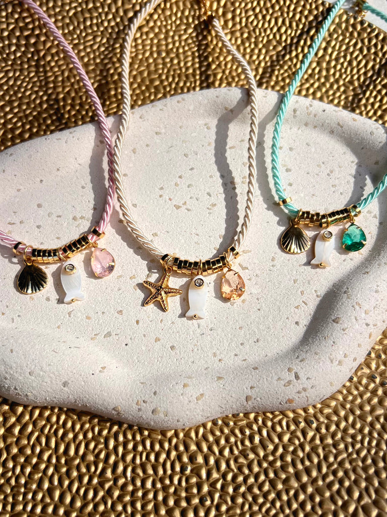 Colar Cordão Torcido Rosa Com Peixe Madrepérola E Micro Zircônia