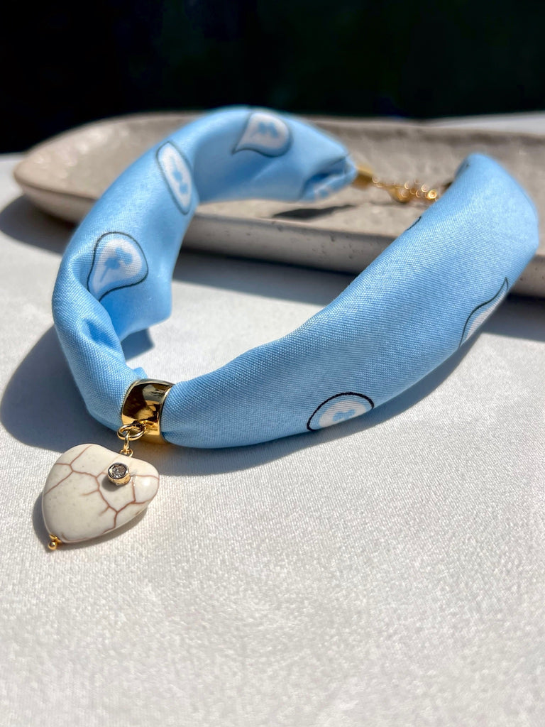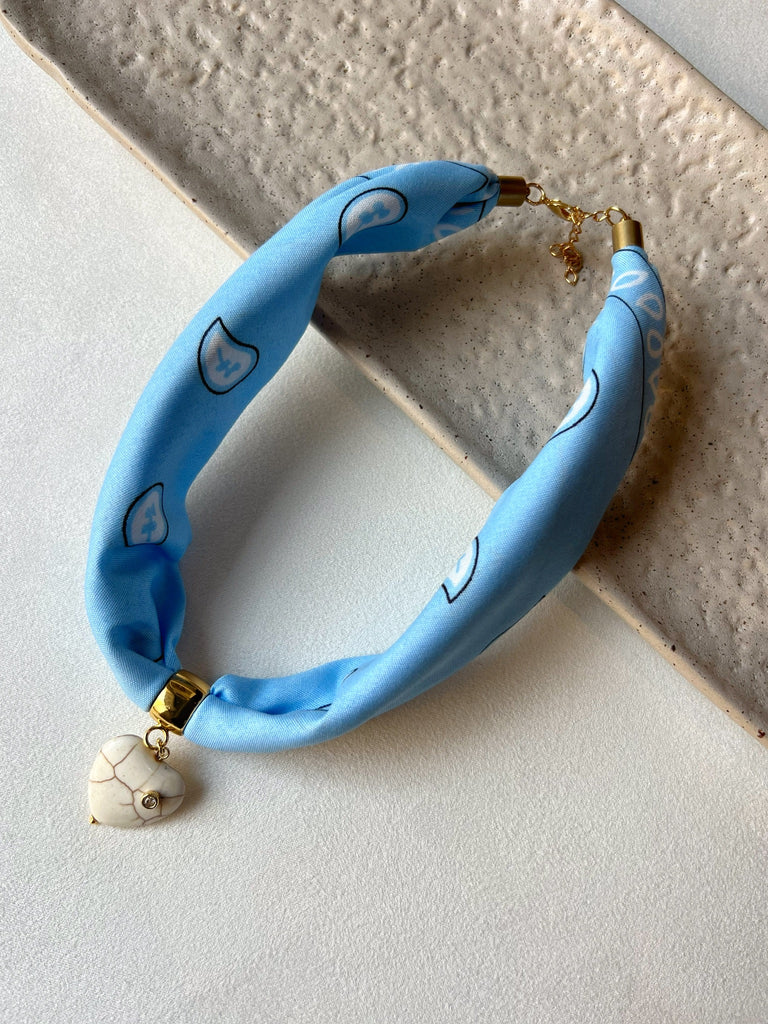Colar Lenço Azul Pingente Coração Pedra Howlita Natural