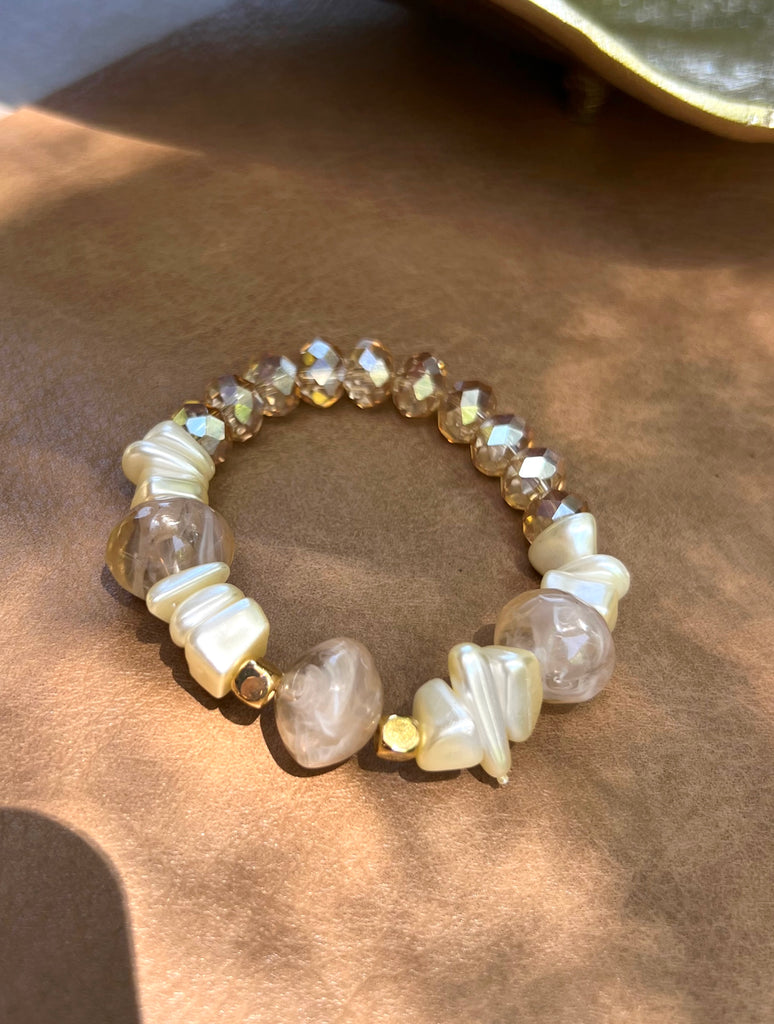 Essa pulseira com pedras orgânicas na cor quartzo bege, hematitas douradas e acrílicos de cascalho pérola - combinam brilho, estilo e elegância em cada detalhe. Um toque moderno de luxo para quem ama se destacar com autenticidade