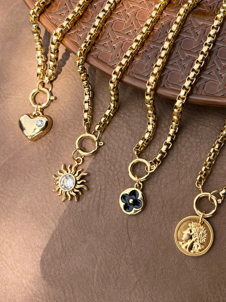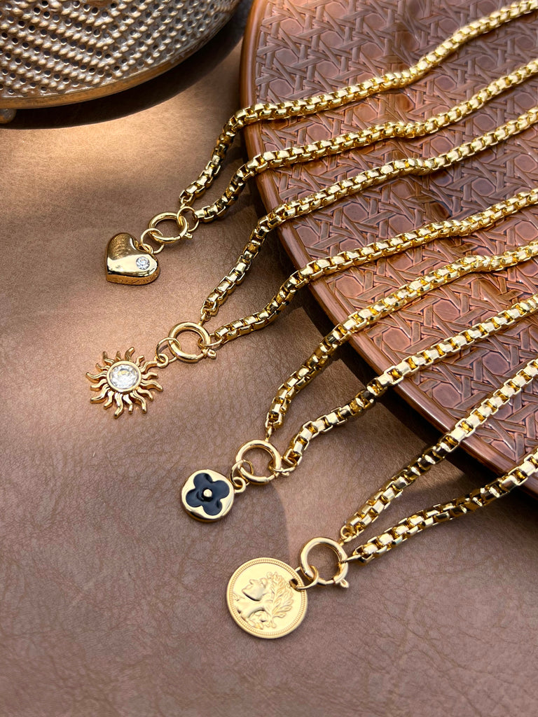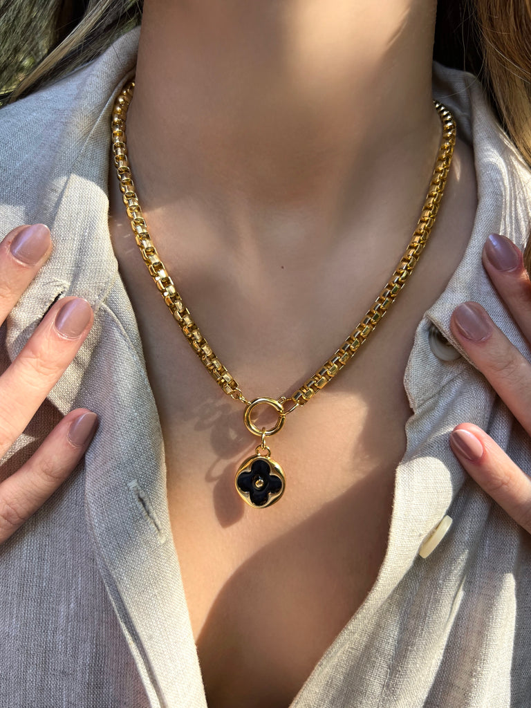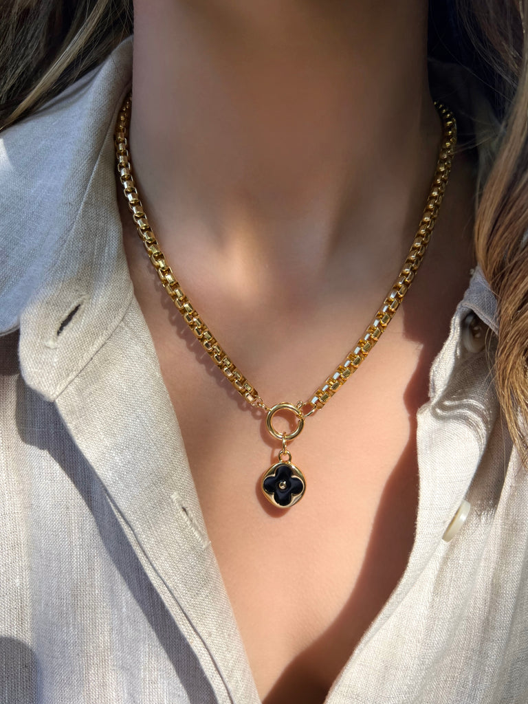 Moderno e cheio de estilo, este colar combina corrente veneziana leve GG com um pingente em forma de trevo com resina cor preto, criando um acessório que ilumina qualquer produção com sofisticação.