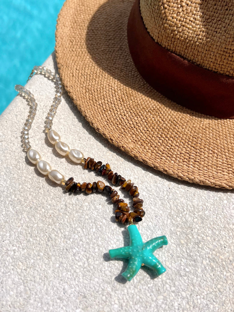 Perfeito para iluminar produções do dia a dia e destacar seu estilo em ocasiões especiais — do jeans e camisa branca ao vestido fluido. Este colar une a delicadeza da estrela do mar em tom turquesa à energia vibrante dos cascalhos olho de tigre! As pérolas barrocas acrílicas, trazem um toque especial, com formas únicas!