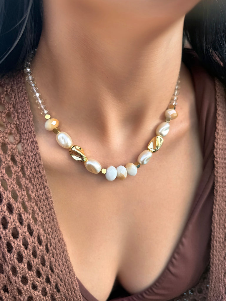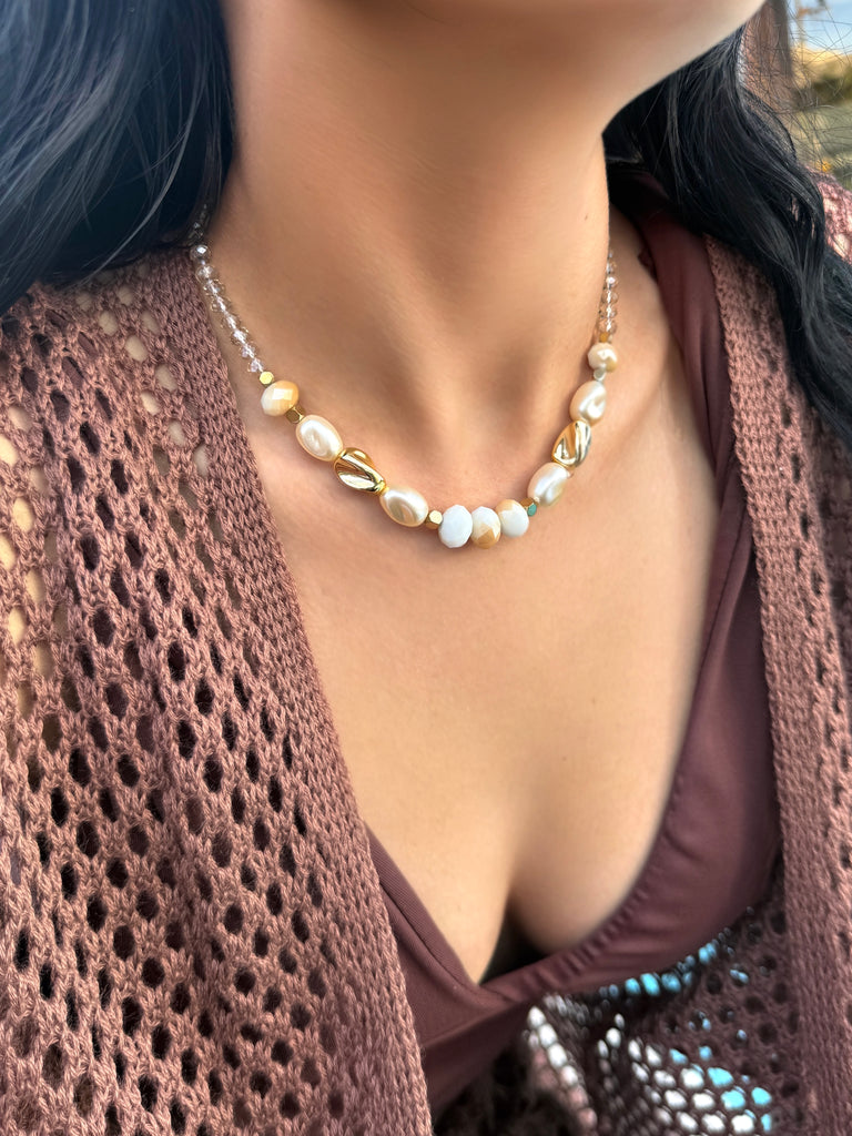 Este colar combina tons pérola e bege em pedras suaves e sofisticadas, criando uma paleta clássica e atemporal. Os detalhes orgânicos dourados trazem textura e movimento, enquanto as hematitas adicionam um brilho contemporâneo que transforma a peça em um destaque único.