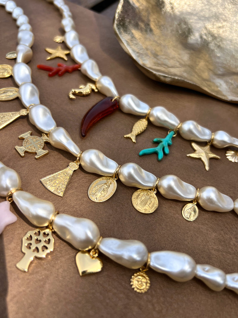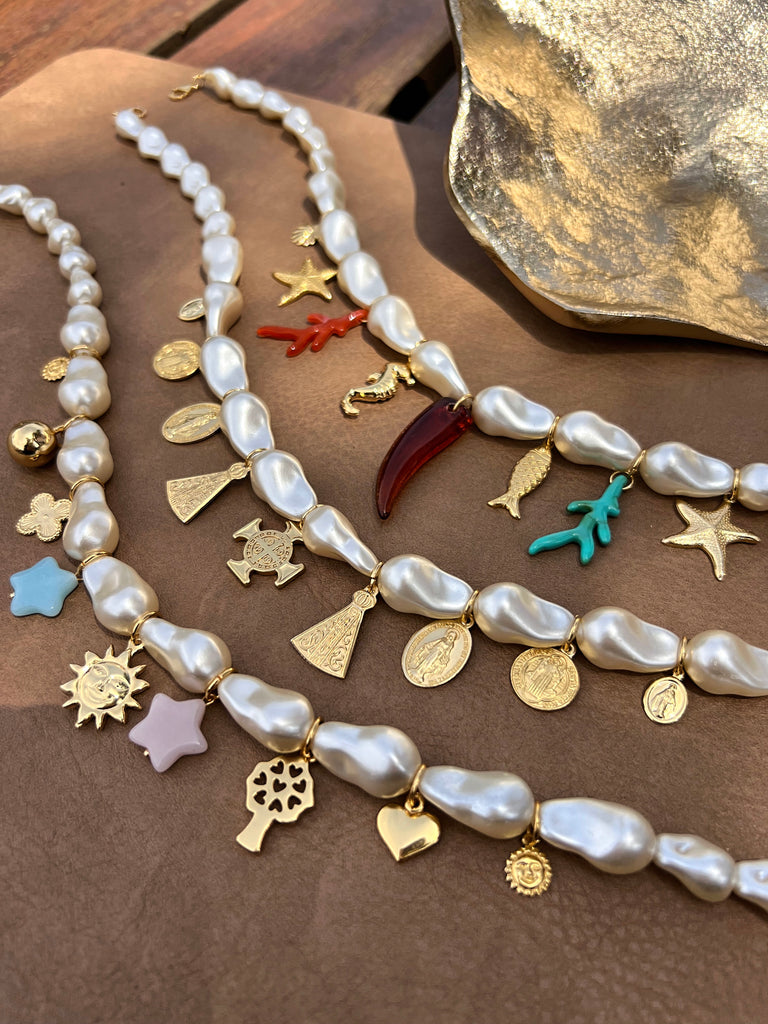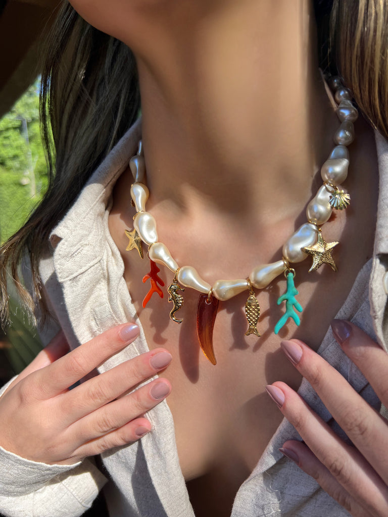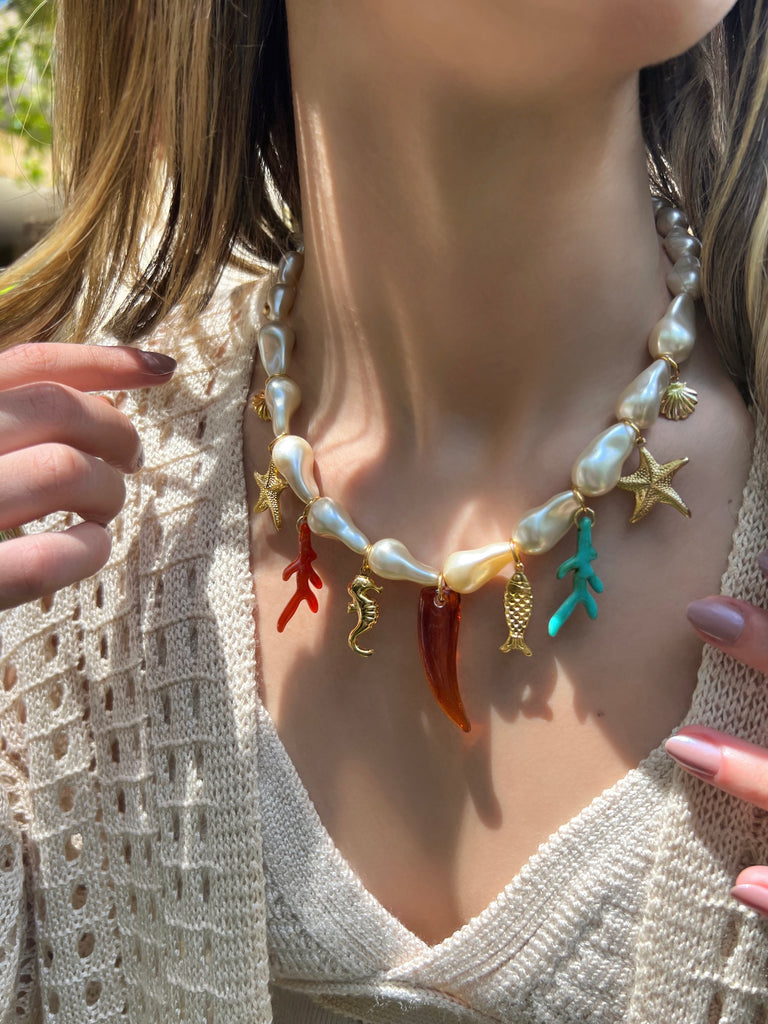 Inspirado na poesia do oceano, este colar une o charme orgânico das pérolas barrocas ao brilho delicado de pingentes temáticos do fundo do mar.