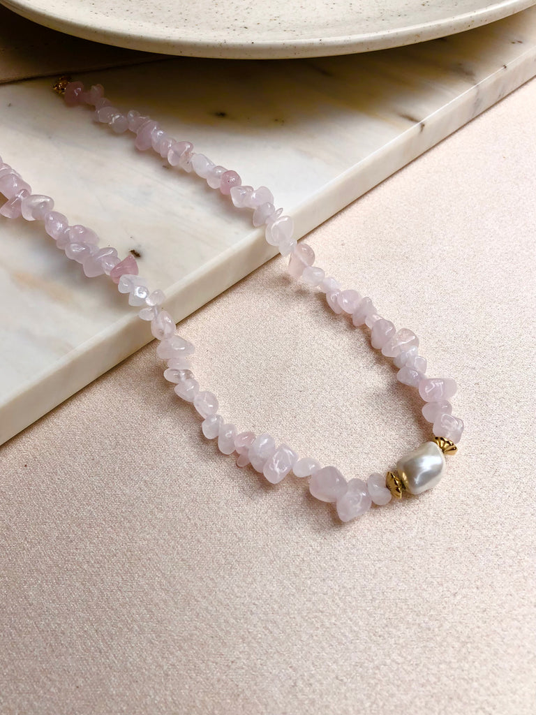 Colar Manuela Cascalho Quartzo Rosa E Pérola Barroca Shell 42cm