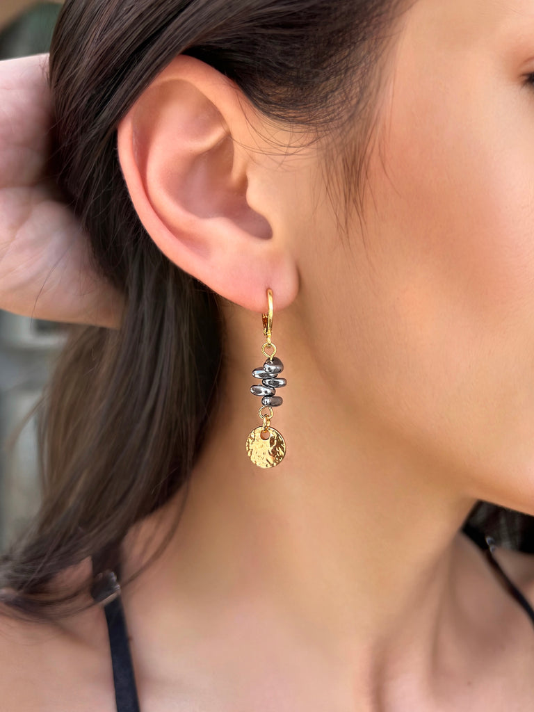 Brinco Argola Cascalho Hematita Ródio E Pin Dourado