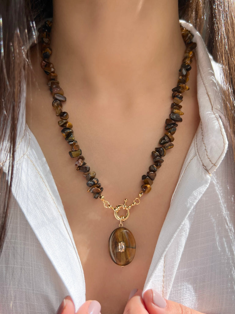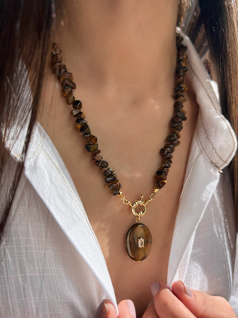 Este colar de 50cm combina cascalhos de Olho de Tigre e Pedra Ágata Marrom, criando uma peça sofisticada e cheia de personalidade. O fecho boia garante a facilidade ao usar, enquanto as pedras naturais oferecem um visual elegante e atemporal, perfeito para quem valoriza estilo com significado.