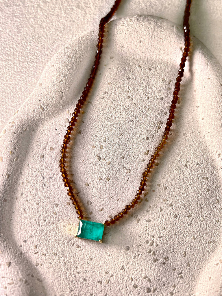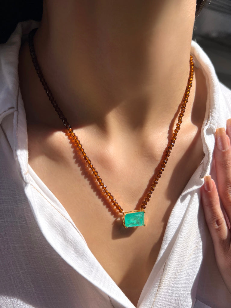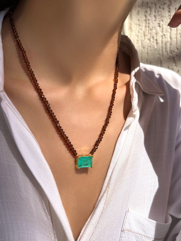Este colar combina cristais marrons com baguete verde Paraíba, criando uma peça sofisticada e única. A tonalidade profunda dos cristais marrons confere elegância, enquanto a baguete verde realça o brilho com um toque de exclusividade. Ideal para quem busca um acessório marcante e refinado, perfeito para ocasiões especiais e que valoriza a beleza dos detalhes.