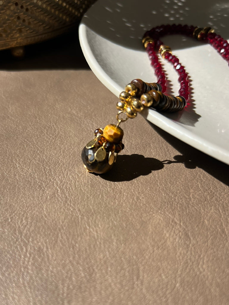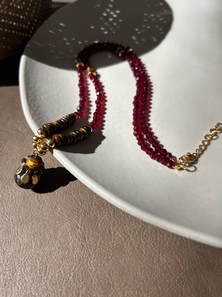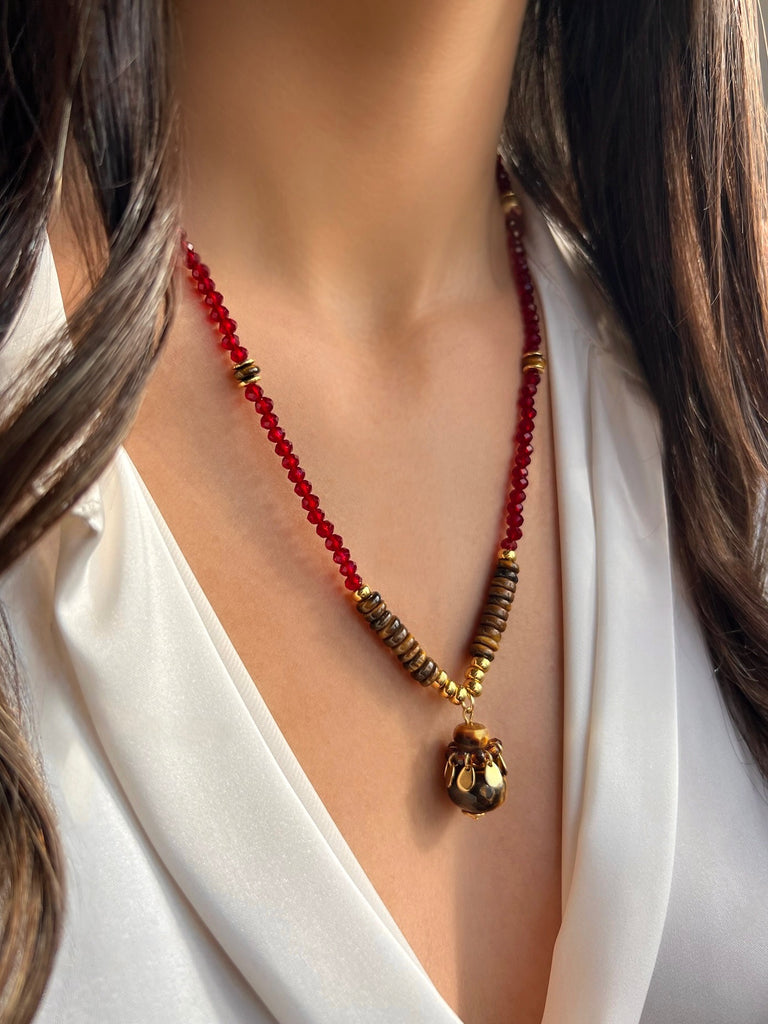 Este colar sofisticado une a energia dos cristais vermelhos à proteção da pedra olho de tigre. Os cristais vermelhos conferem brilho e intensidade, enquanto a pedra olho de tigre promove equilíbrio e foco.