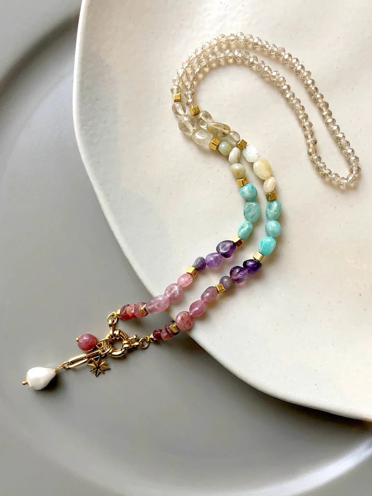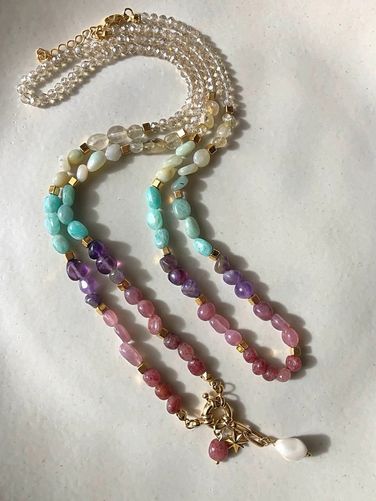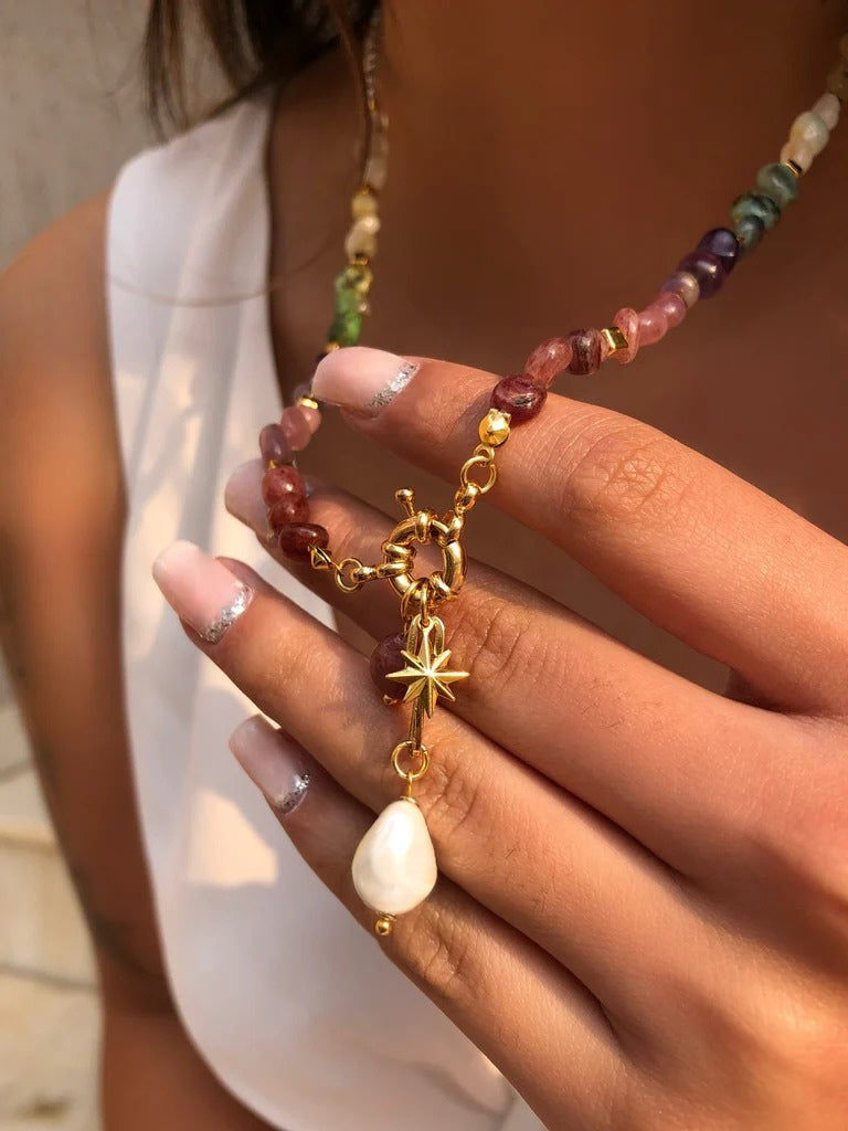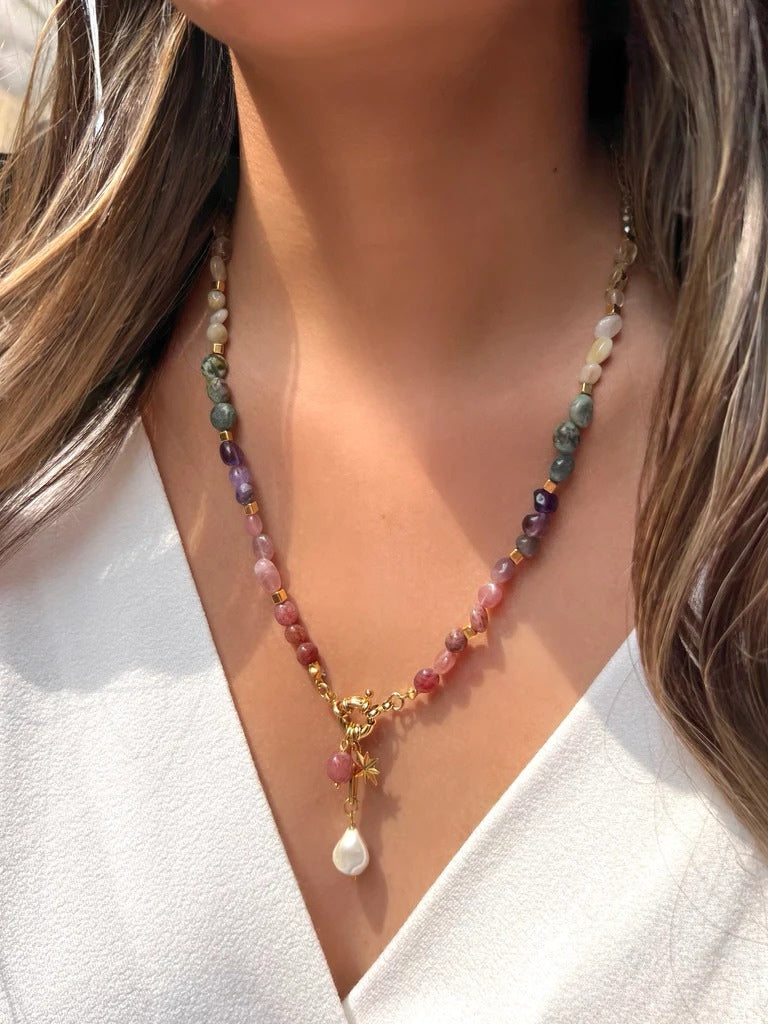 Este colar exclusivo combina a beleza rústica das pedras naturais multicoloridas com o charme elegante dos detalhes dourados e um pingente central delicado. Composto por pedras cuidadosamente polidas, intercaladas com cubos metálicos, o destaque fica para o fecho frontal decorativo, que traz um toque sofisticado com mini pingentes dourados e uma pérola barroca assimétrica.
