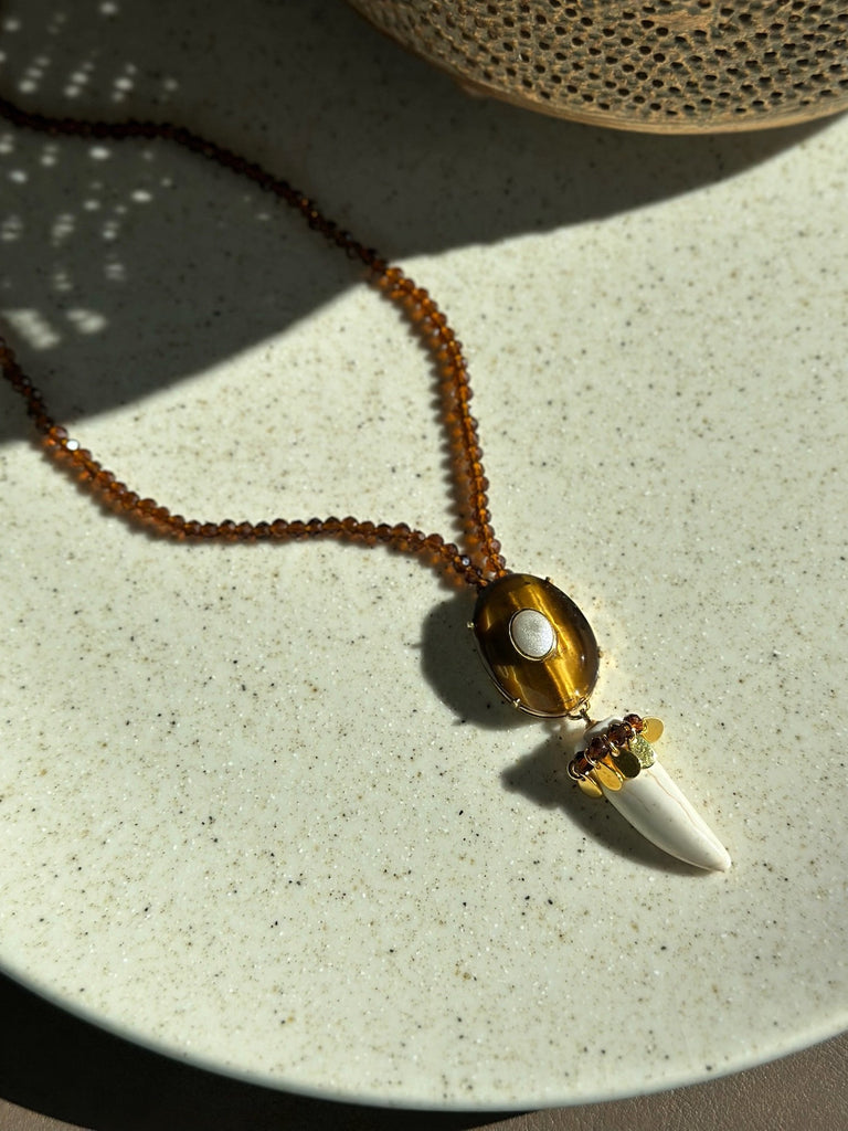 Colar exclusivo com pedra natural Olho de Tigre e dente de Howlita, estendendo-se por 55cm de comprimento. A combinação harmoniosa entre o âmbar vibrante do Olho de Tigre e o branco imaculado da Howlita cria uma peça de rara elegância. Cada elemento natural confere não apenas beleza singular, mas também a energia característica destas pedras preciosas, complementando com sofisticação qualquer conjunto.