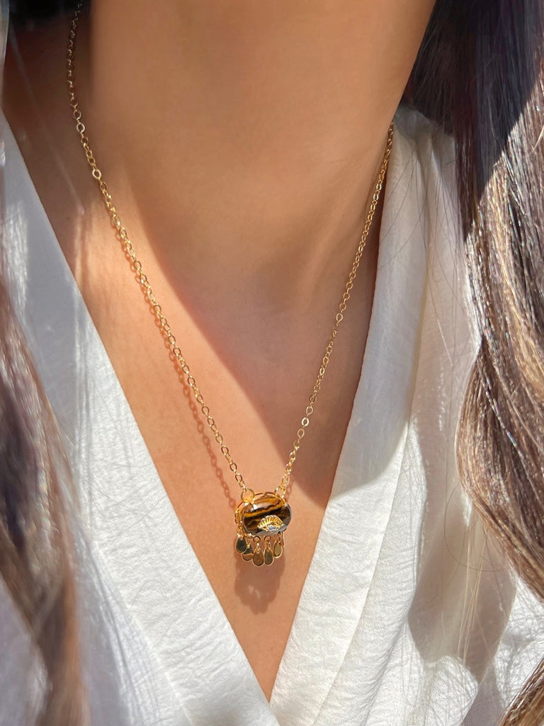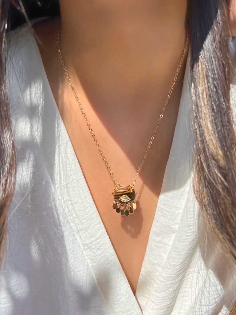 Este colar de 45cm apresenta uma composição elaborada com pedra olho de tigre e pingente em formato de olho cravejado, complementada por pingentes em mini gotas. Com caimento ideal, destacando-se pela combinação equilibrada entre elementos decorativos e acabamento de alta qualidade.