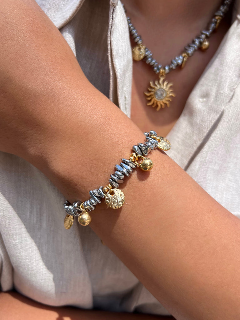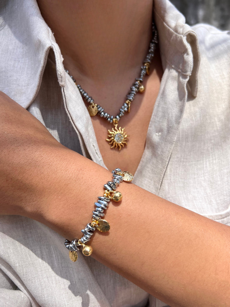 Pulseira confeccionada em cascalho de hematita com detalhes em ródio e pingentes banhados a ouro. O comprimento de 16cm proporciona encaixe preciso, garantindo conforto e elegância.
