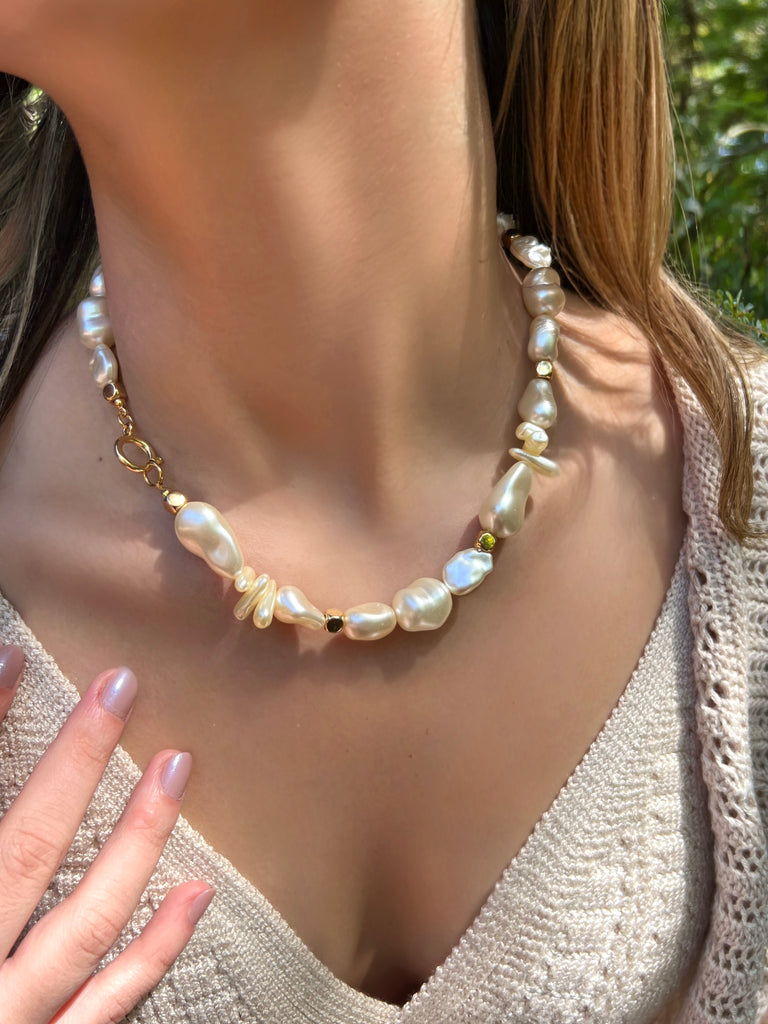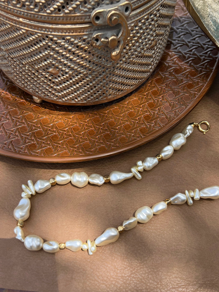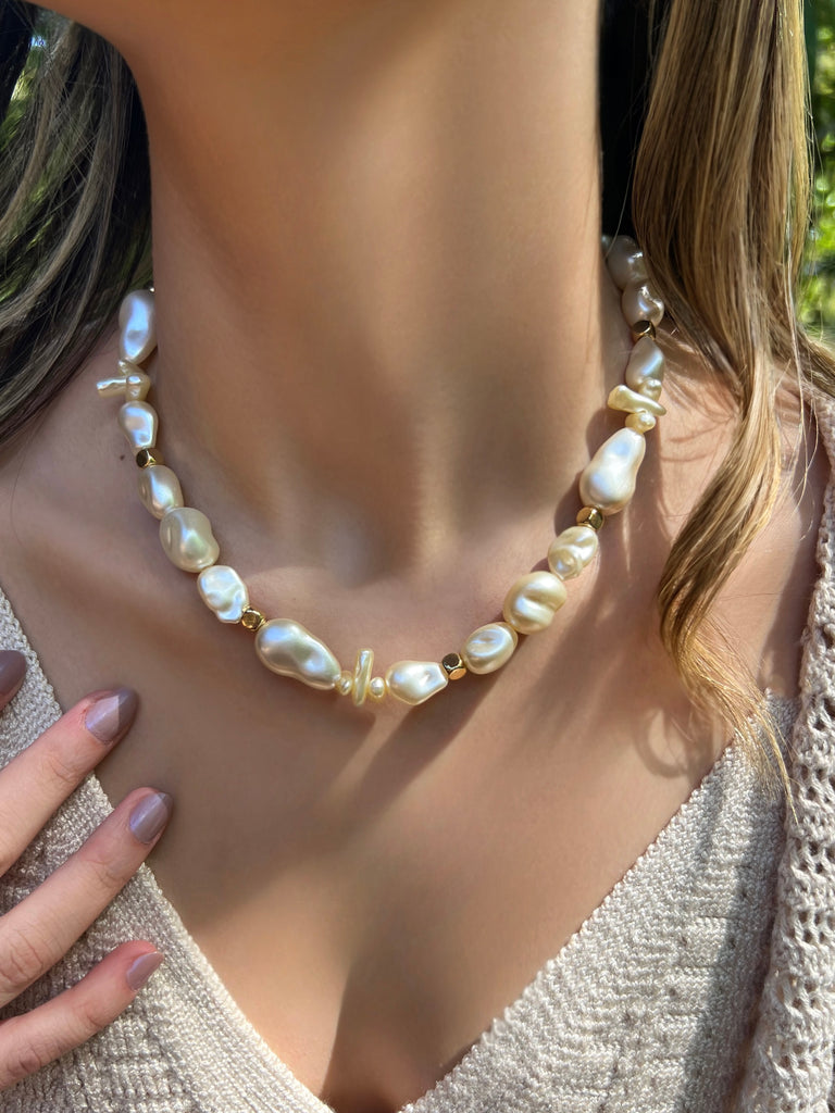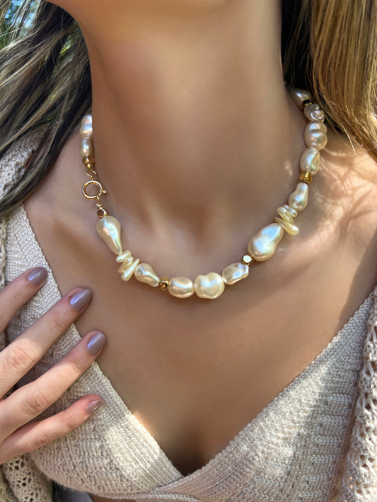 Uma peça que redefine o clássico. Este colar combina pérolas acrílicas em diferentes formas e tamanhos com hematitas douradas, criando um visual contemporâneo, cheio de textura e personalidade. O destaque fica por conta do fecho bóia, que pode ser usado de múltiplas formas — frontal, lateral ou discreto atrás — permitindo transformar o estilo conforme o humor e o look do dia. Design inteligente, moderno e cheio de atitude.