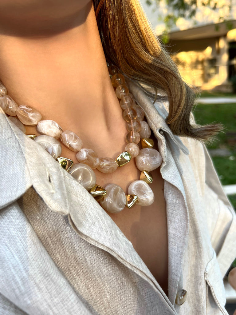 Esses colares traduzem a elegância em cada detalhe, com uma composição exuberante de pedras orgânicas na cor bege rajado, detalhes em metais orgânicos dourados e hematitas douradas. Resultando em peças de brilho singular e presença marcante. Modelo extravagante, com pedras grandes — feito para mulheres que apreciam o extraordinário.