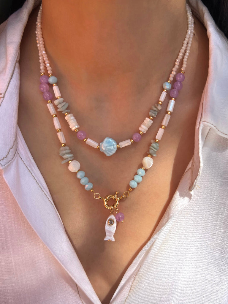 Mix De Dois Colares Pedras Naturais E Concha Azul E Peixe Madrepérola