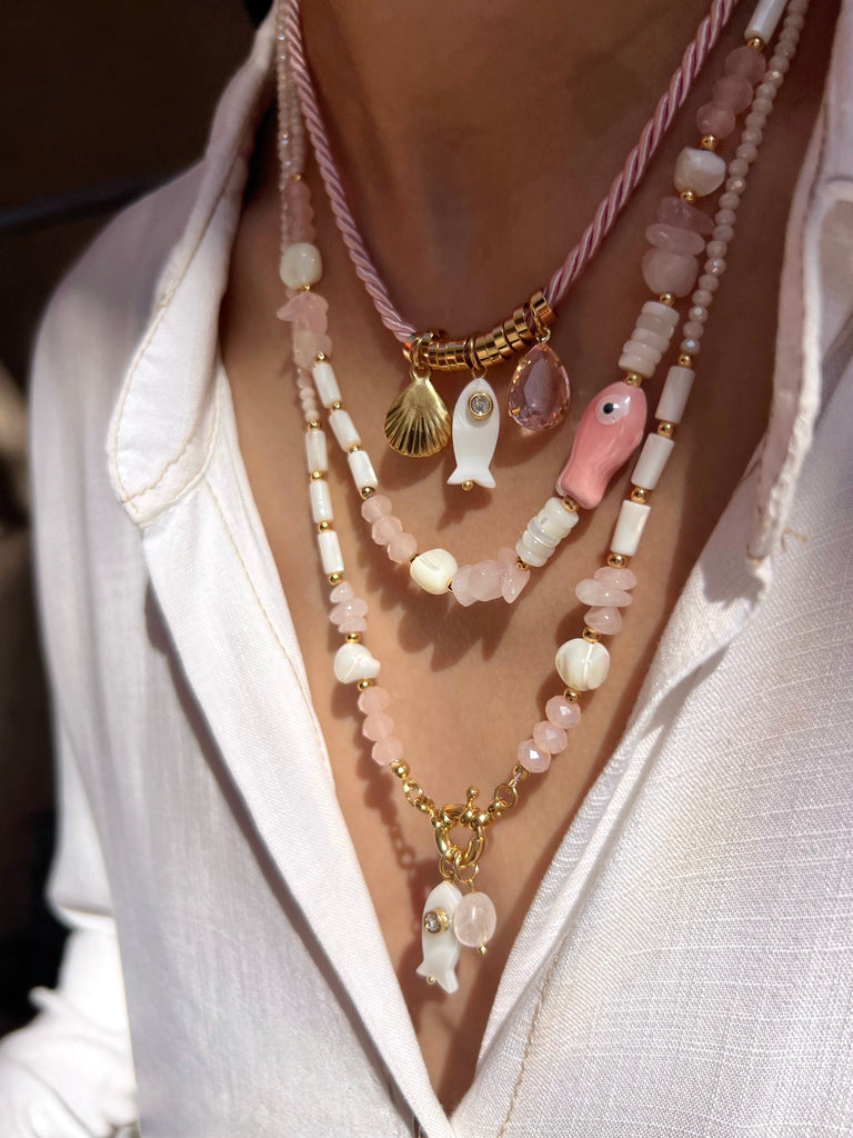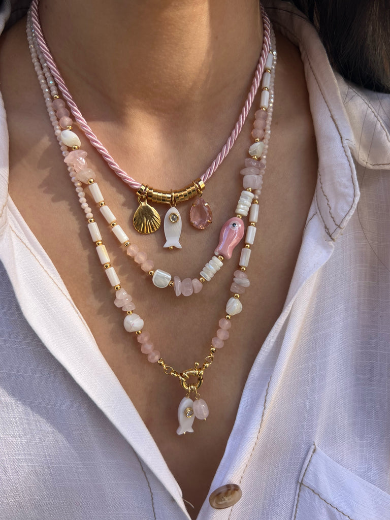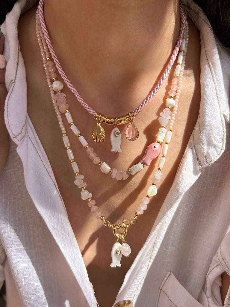 Aproveite o charme único deste mix de três colares com pingente de sardinha e pedras naturais na cor rosa.