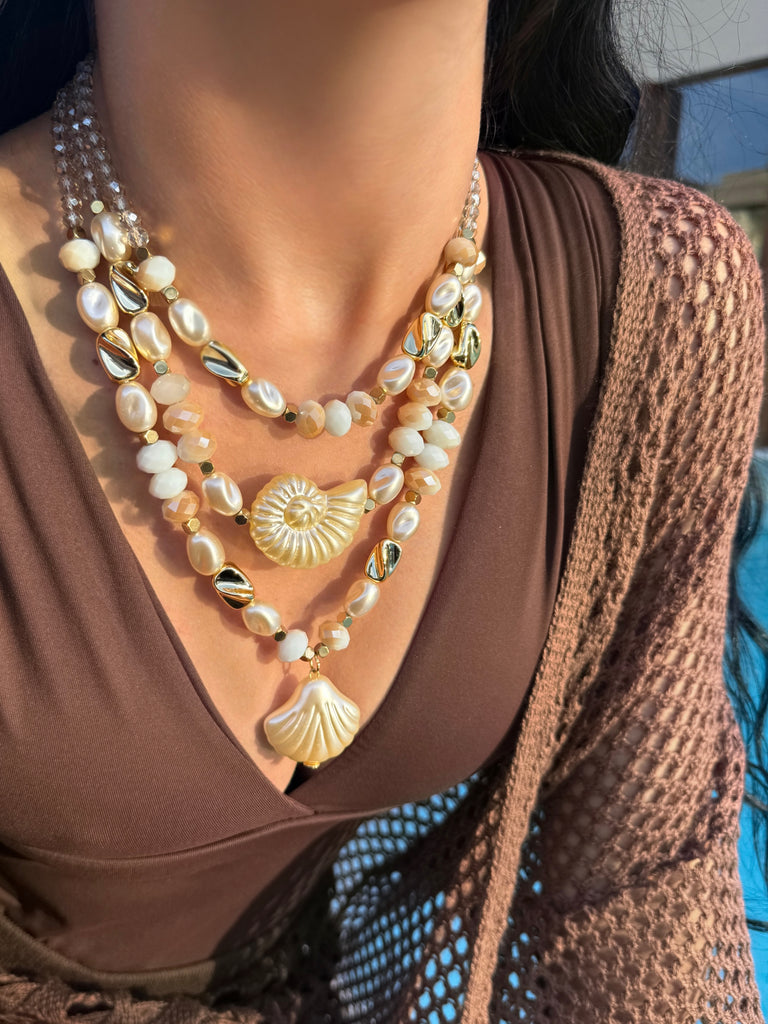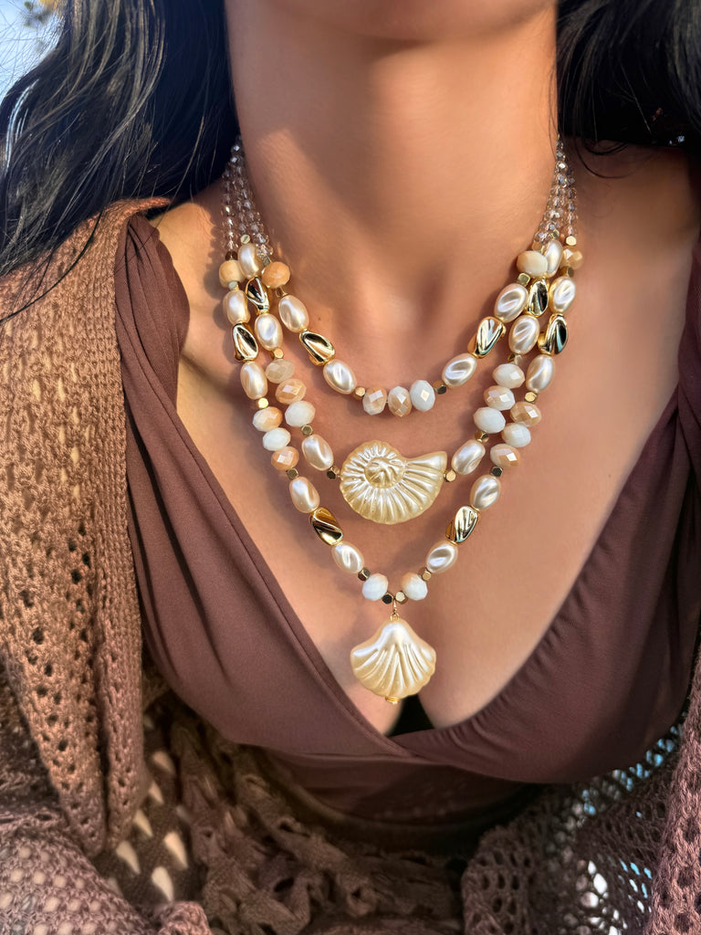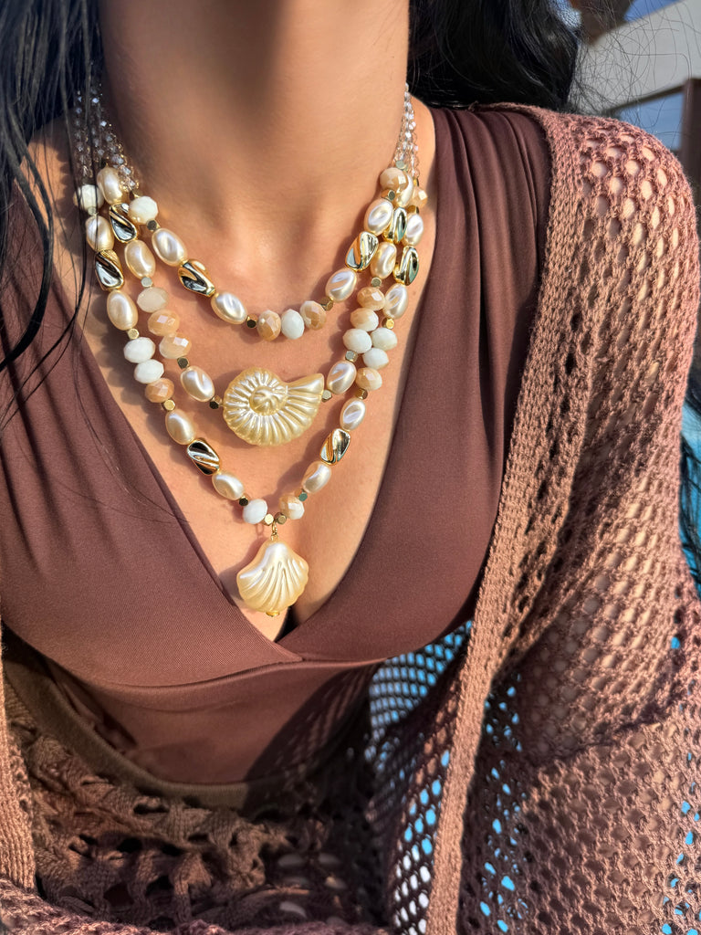 Este mix reúne nossos colares com tons neutros, conchas e caracóis em pérola, pedras bege e detalhes em hematitas, criando uma combinação elegante e sofisticada. Cada peça se destaca sozinha, mas juntas formam um mix versátil, perfeito para sobreposições modernas e looks cheios de personalidade.