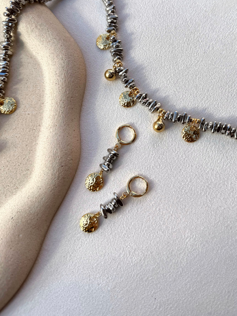 Brinco Argola Cascalho Hematita Ródio E Pin Dourado