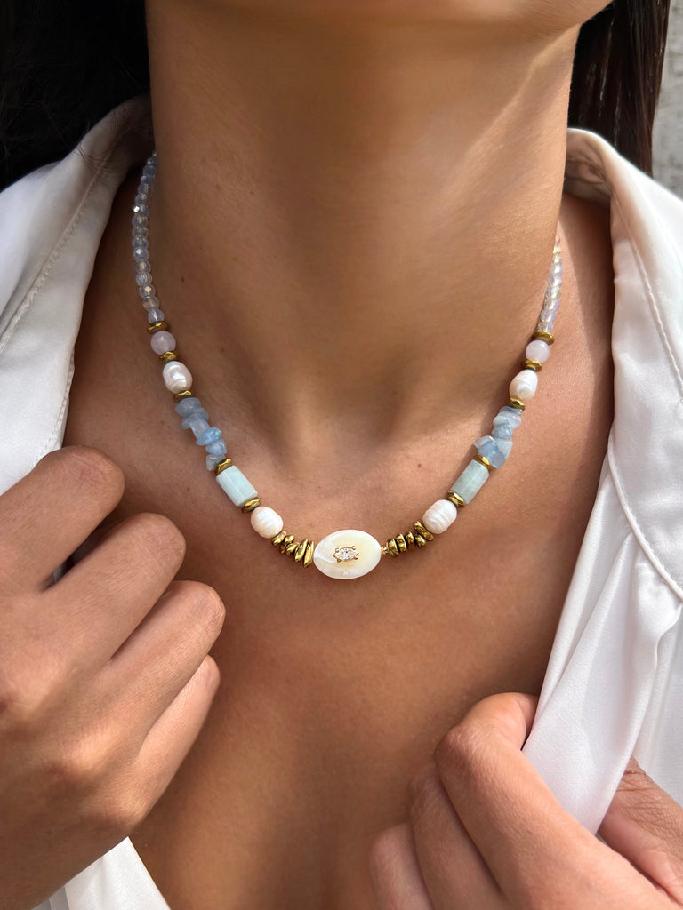Colar elegante que combina a pedra jade azul natural com madrepérola e detalhes em hematitas, criando uma composição sofisticada e equilibrada. As pedras naturais conferem autenticidade e energia, enquanto o acabamento refinado reflete a qualidade da peça.