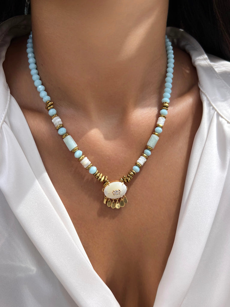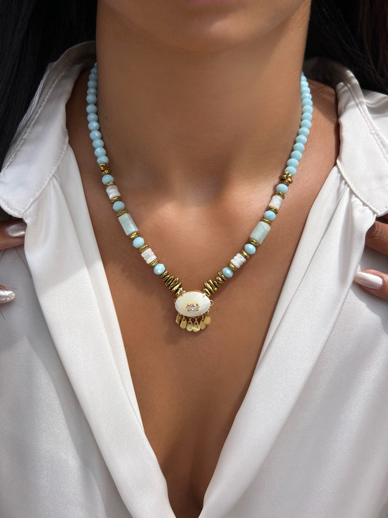 Colar elegante que combina a pedra jade azul natural com madrepérola e detalhes em gotas penduradas, criando uma composição sofisticada e equilibrada. As pedras naturais conferem autenticidade e energia, enquanto o acabamento refinado reflete a qualidade da peça.