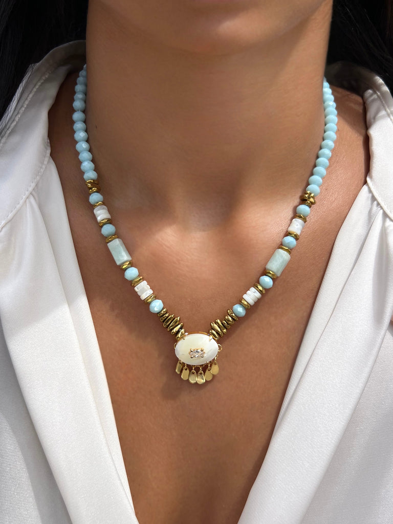 Colar Jade Azul E Madrepérola Com Gotas Penduradas 45cm