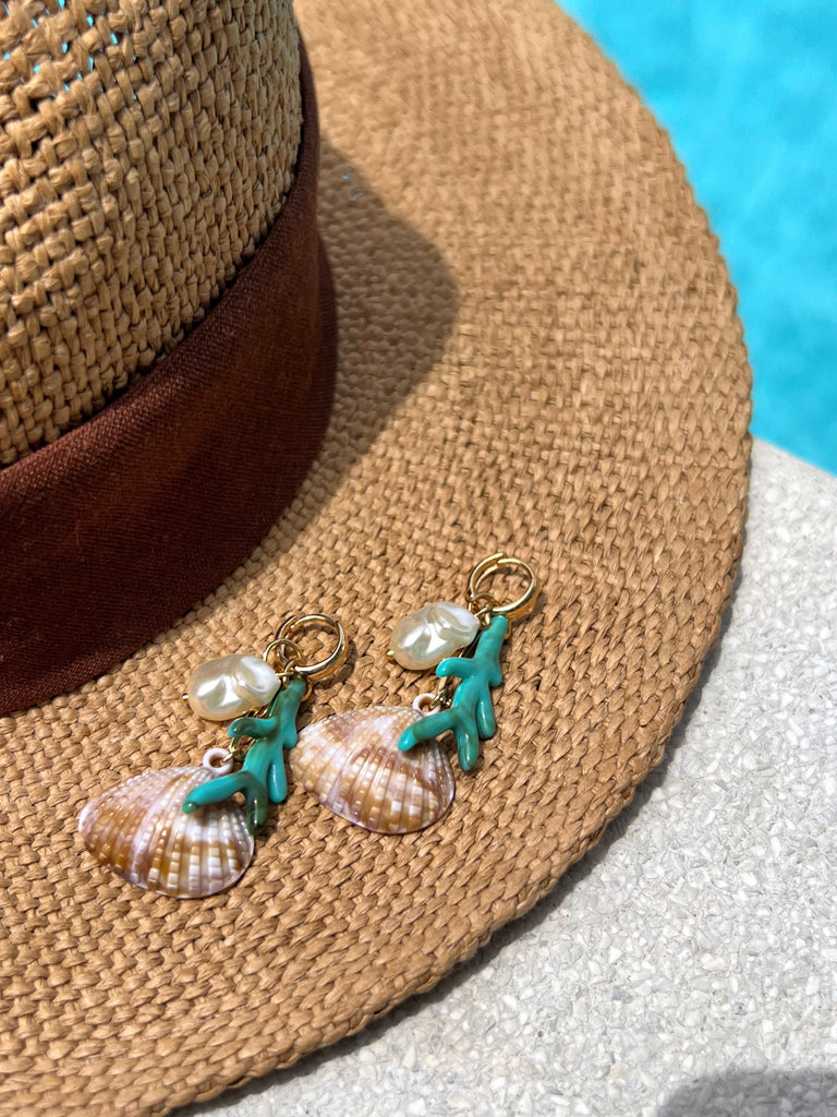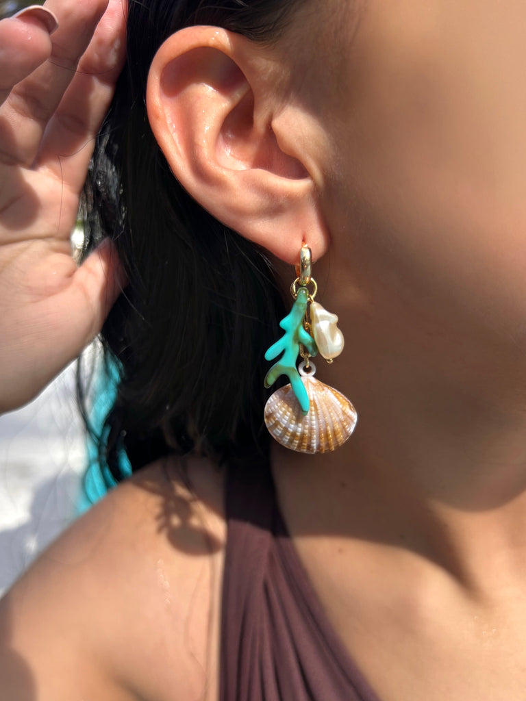 Este brinco une a delicadeza da concha à energia vibrante da alga turquesa, criando contraste e movimento. A pérola barroca acrílica adiciona textura e sofisticação, tornando cada peça única e cheia de charme.