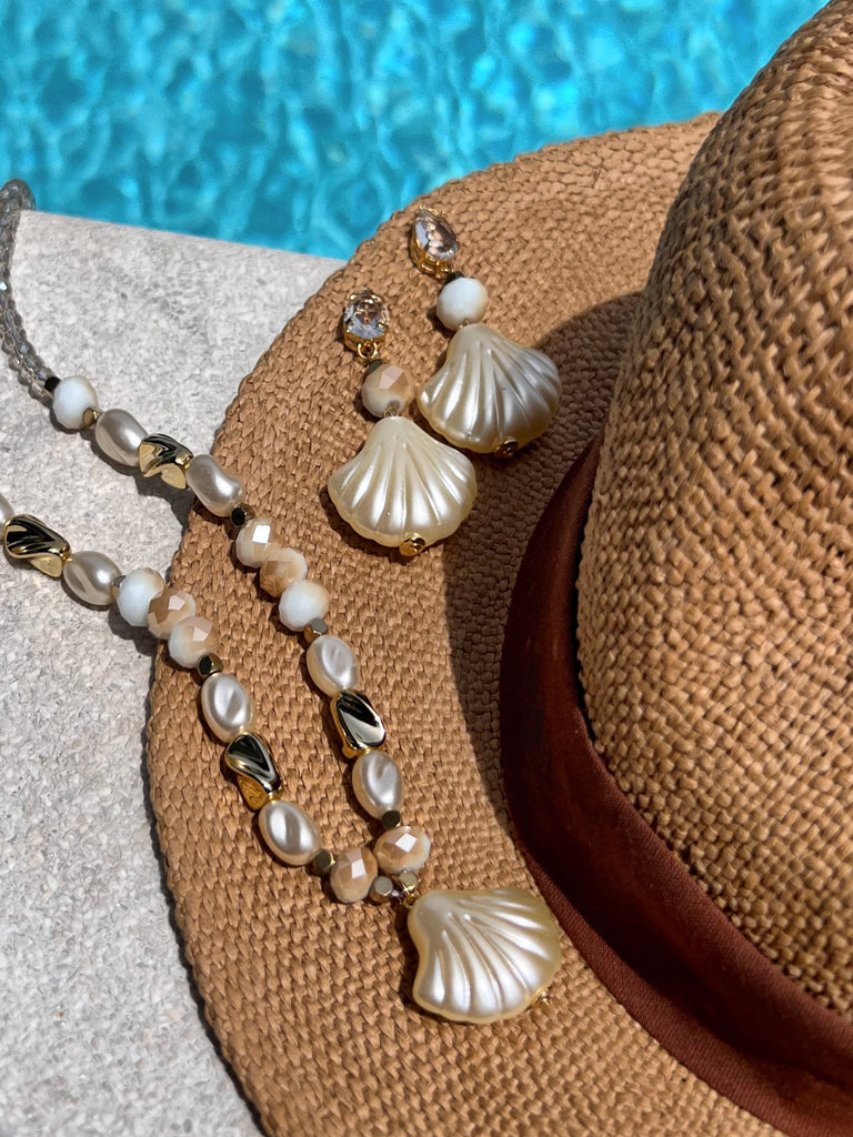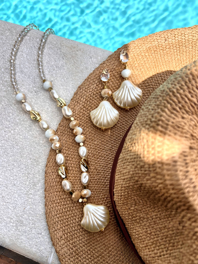 Este brinco combina a sofisticação do cristal em formato de gota com a suavidade da concha em pérola, criando um design elegante e moderno. Os detalhes em hematitas adicionam brilho sutil e um toque contemporâneo, tornando a peça perfeita para quem busca charme e versatilidade.