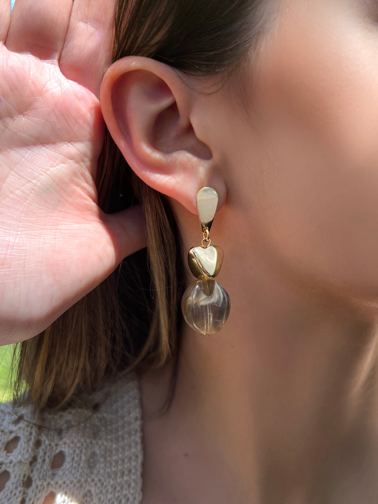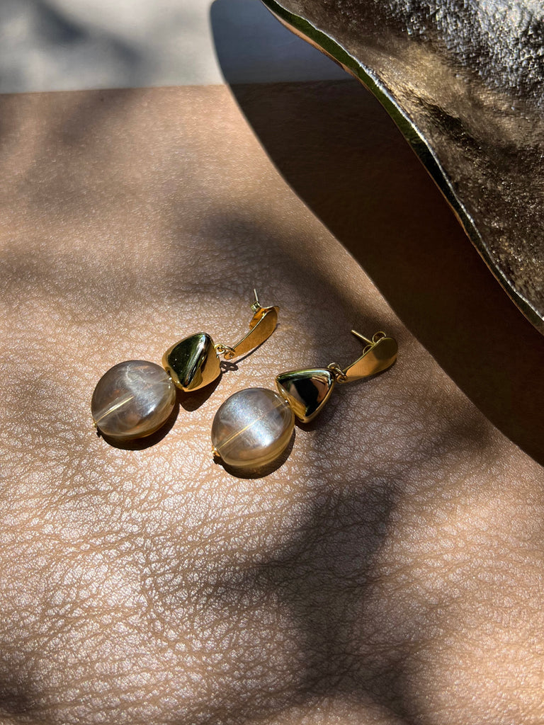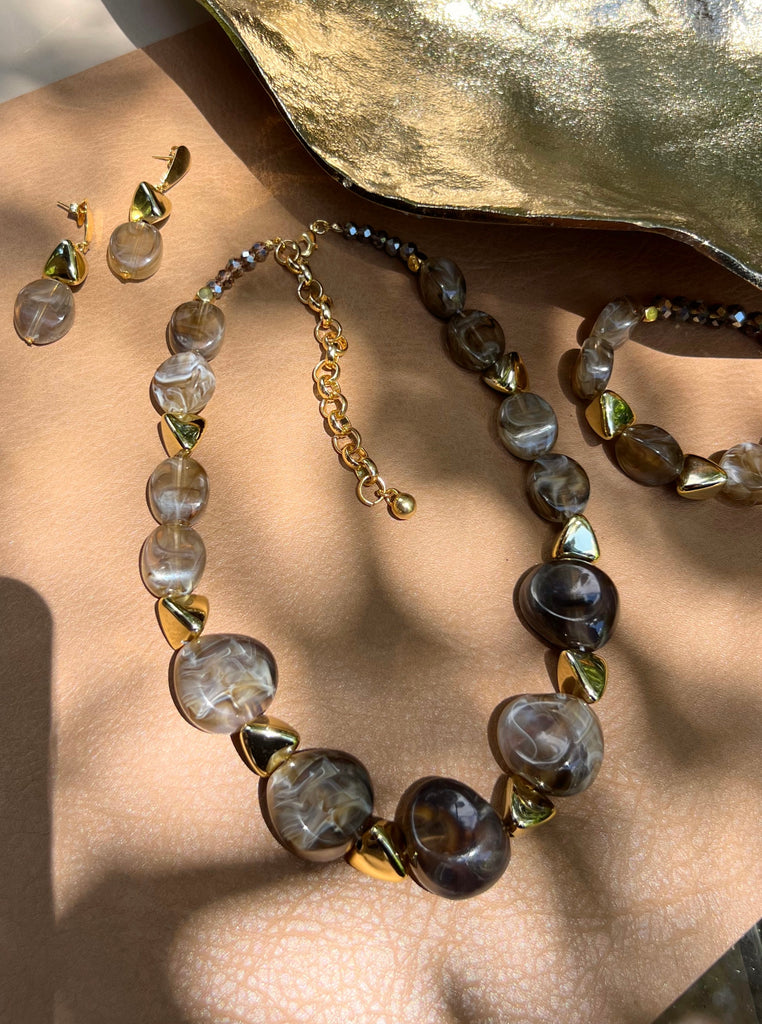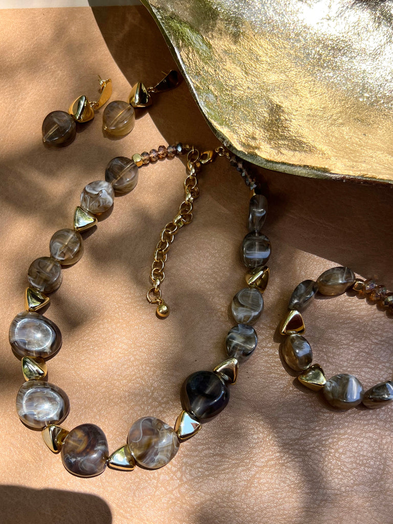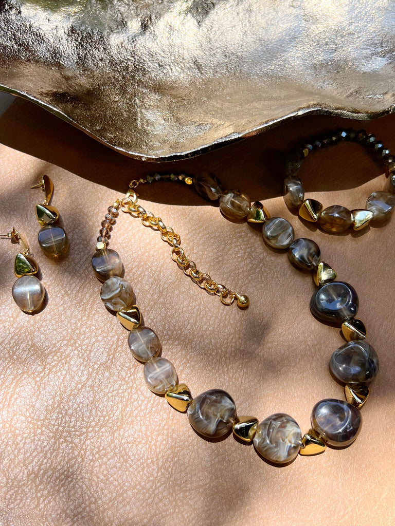 Com pedra acrílica na cor marrom café e detalhes em orgânicos dourados, cada par combina brilho e sofisticação em perfeita harmonia. Um toque moderno de luxo para realçar sua beleza com estilo e personalidade.