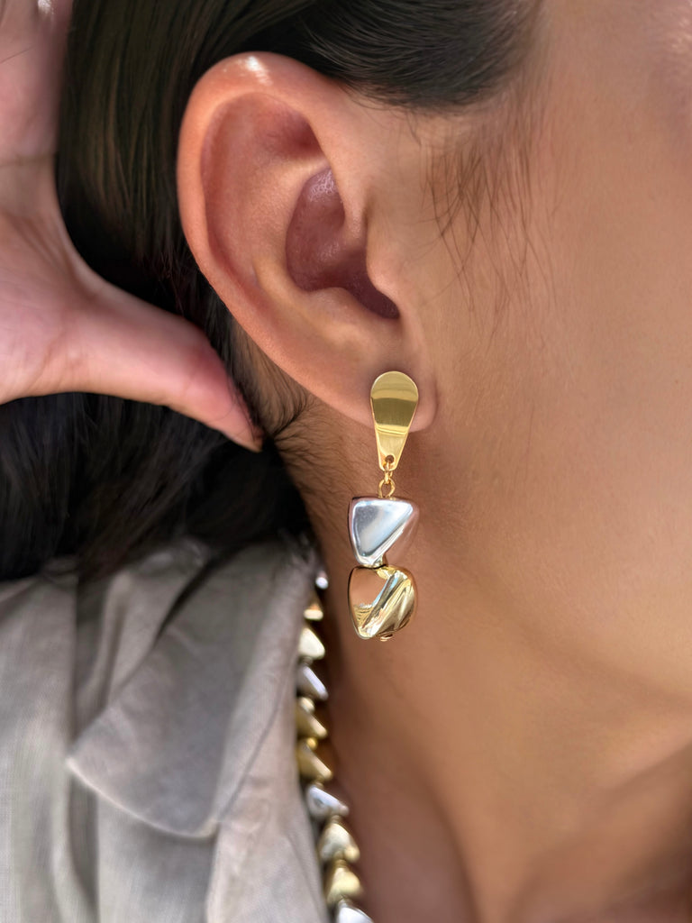 Brincos triangulares com design geométrico moderno, apresentando acabamento em banho ouro e ródio branco que realça o brilho e a elegância. Peça versátil que combina com diversos estilos, desde looks minimalistas até composições mais ousadas. Ideal para quem busca acessórios sofisticados que transitam entre o casual e o formal com facilidade.
