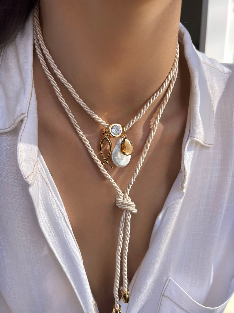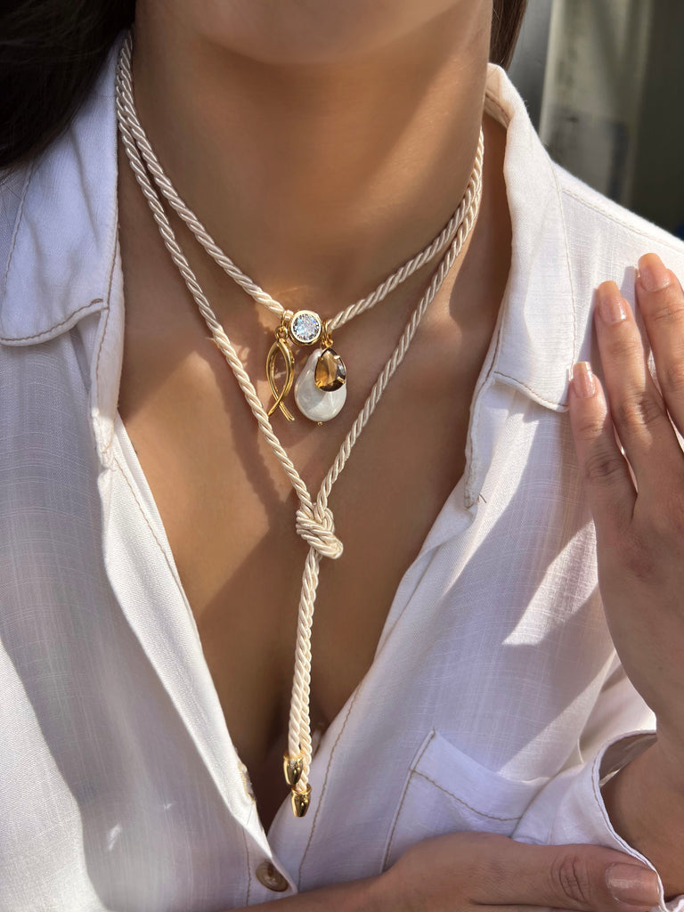 Super versátil, este colar une o charme do cordão fendi na cor off white com a delicadeza de pingentes modernos, criando uma peça elegante e atemporal. Crie diversas amarrações do seu jeito!