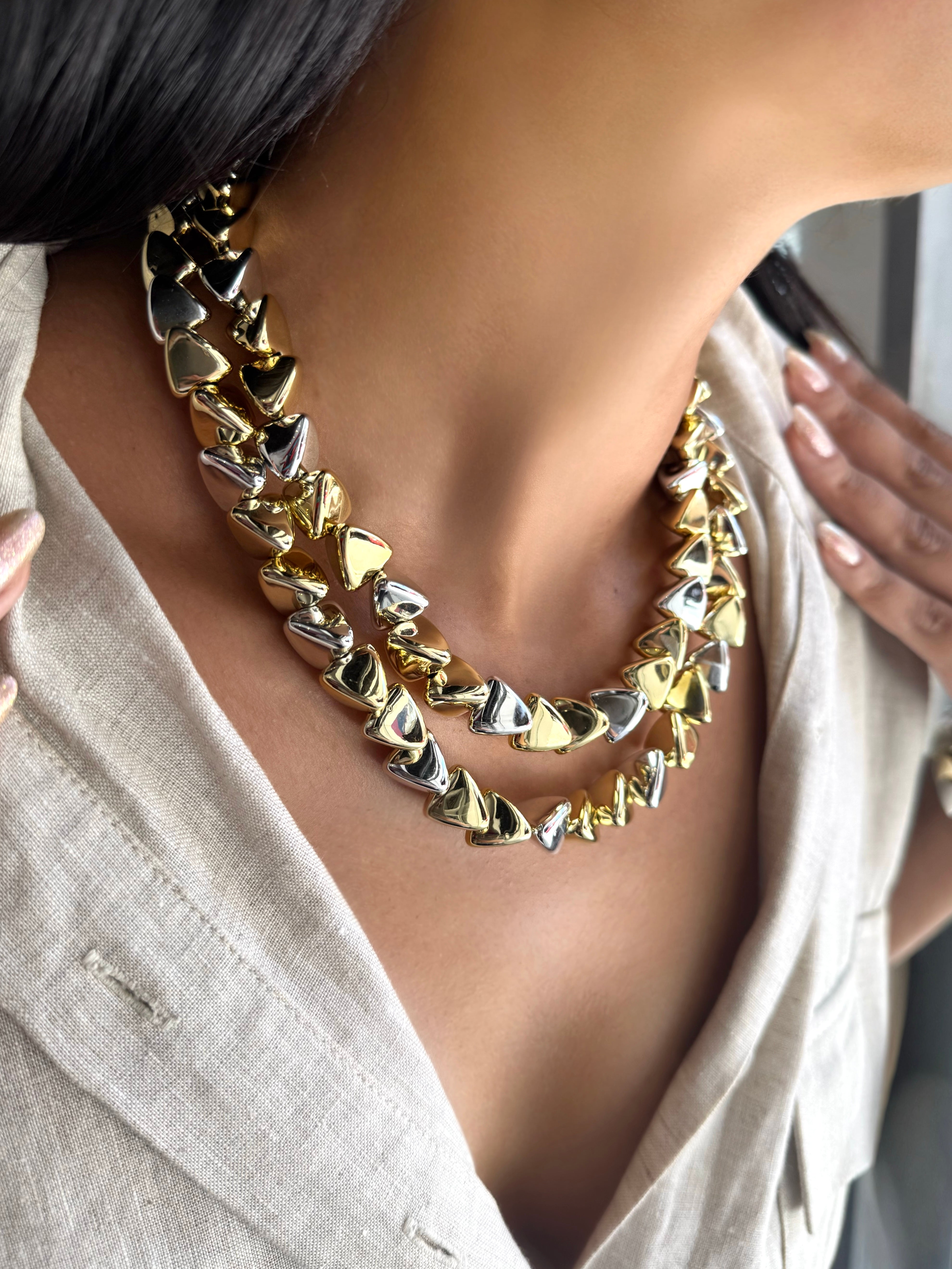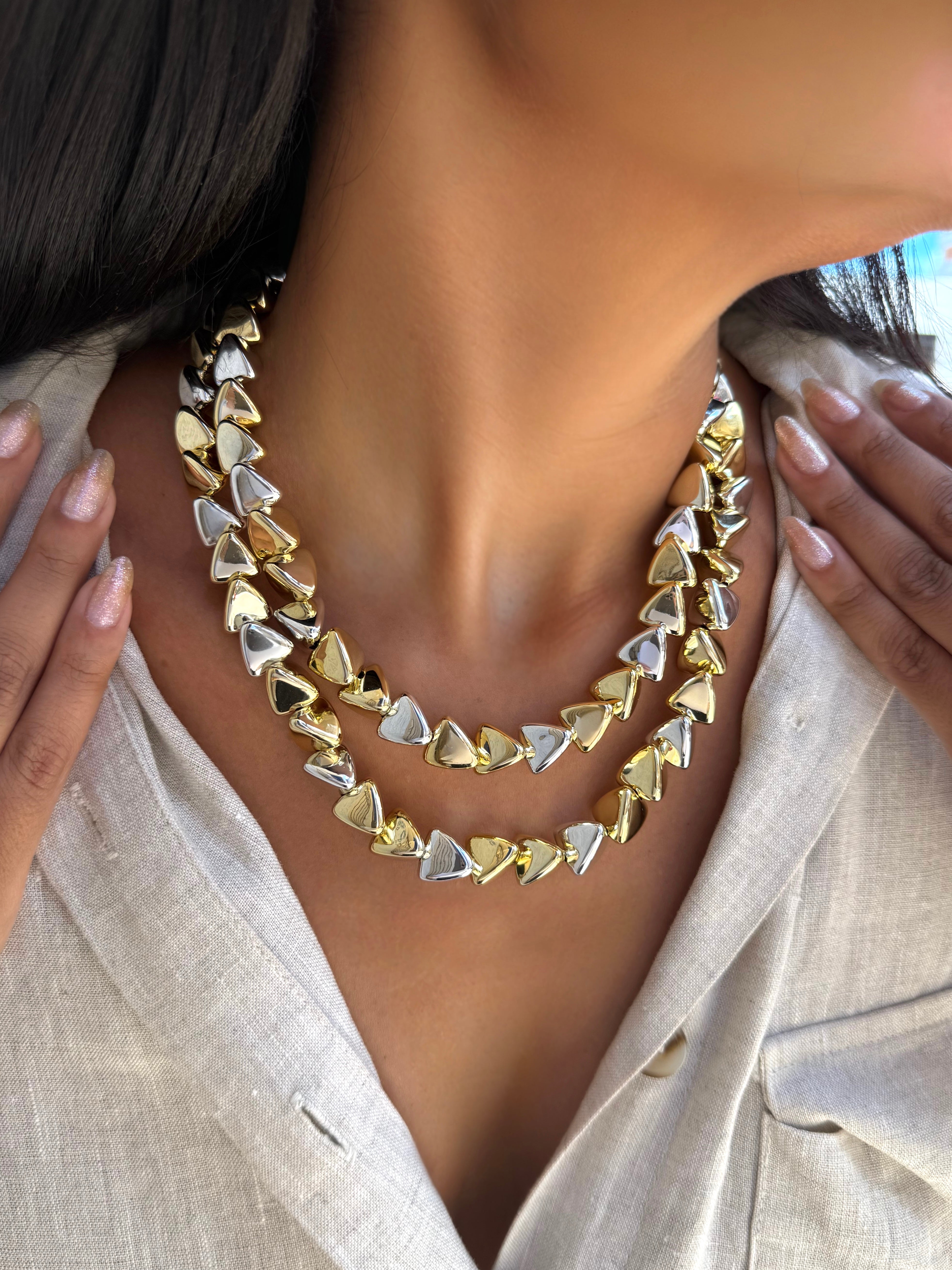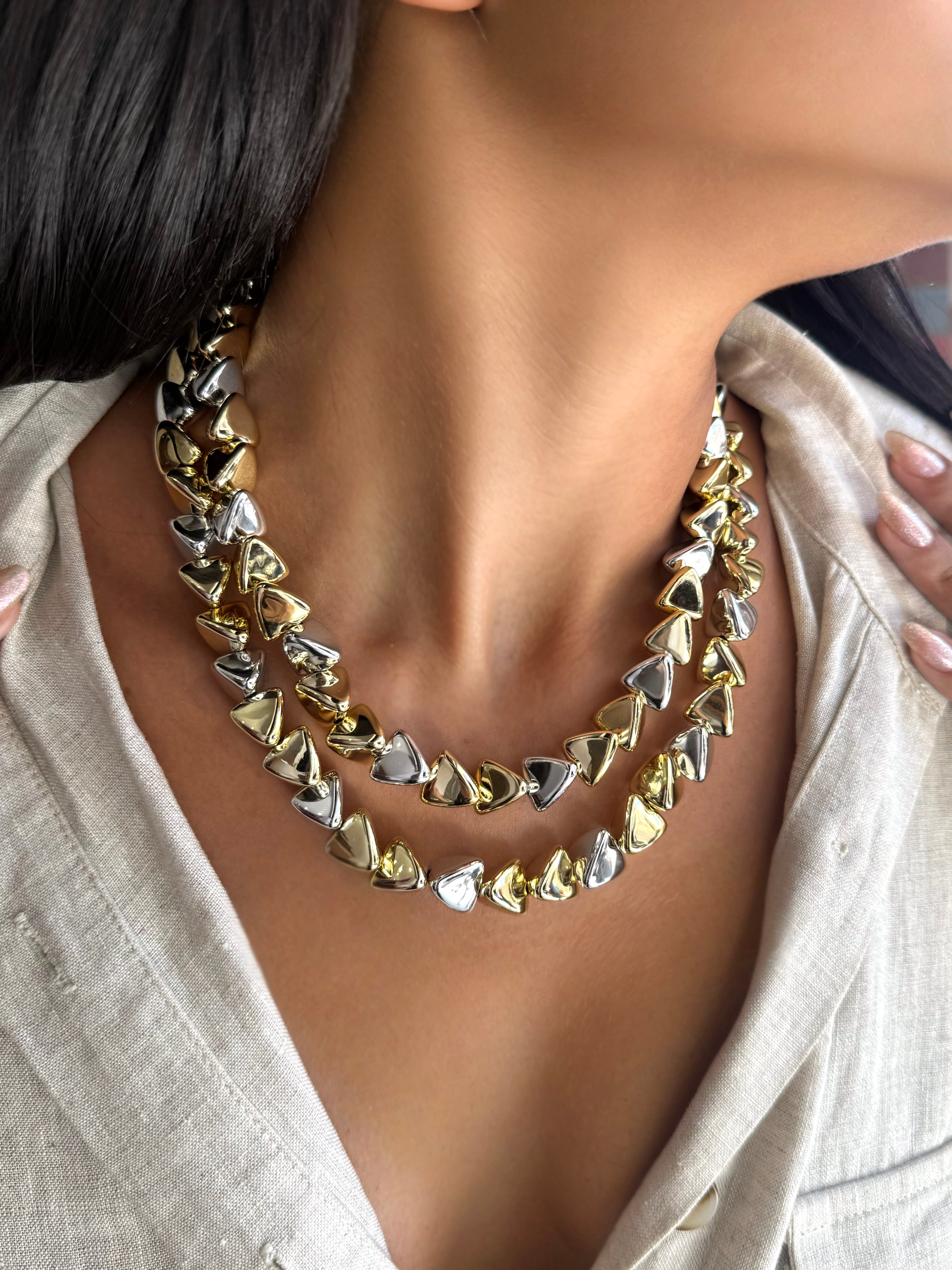 Baixo estoque!Mix com dois colares forma de triângulo duo com design geométrico minimalista em banho de ouro e ródio branco. Peça versátil que combina elegância com sofisticação atemporal, ideal para complementar looks do dia a dia ou ocasiões especiais. Acabamento em banho garante brilho duradouro e resistência. Perfeito como presente ou para quem aprecia joias com personalidade geométrica refinada.