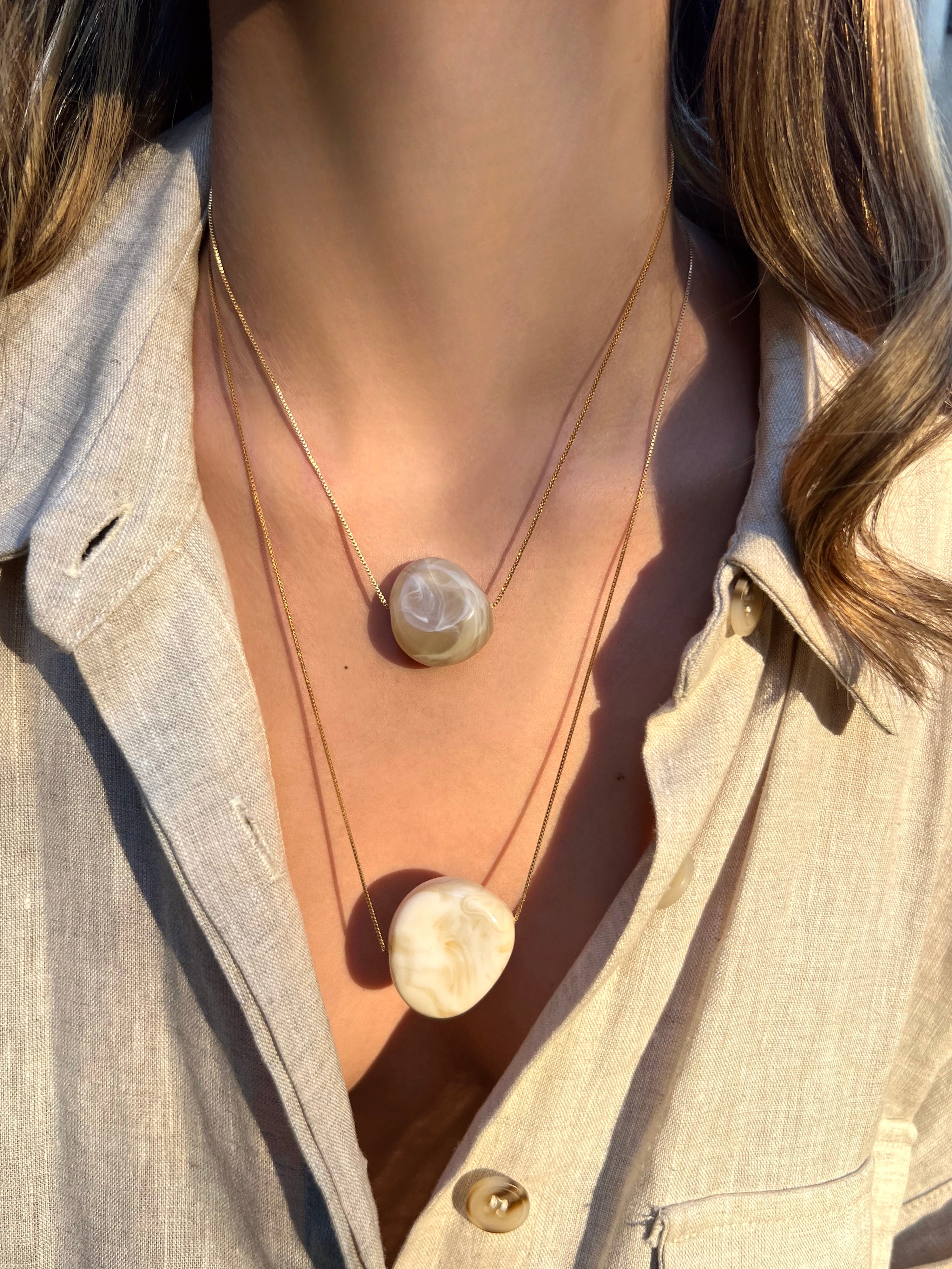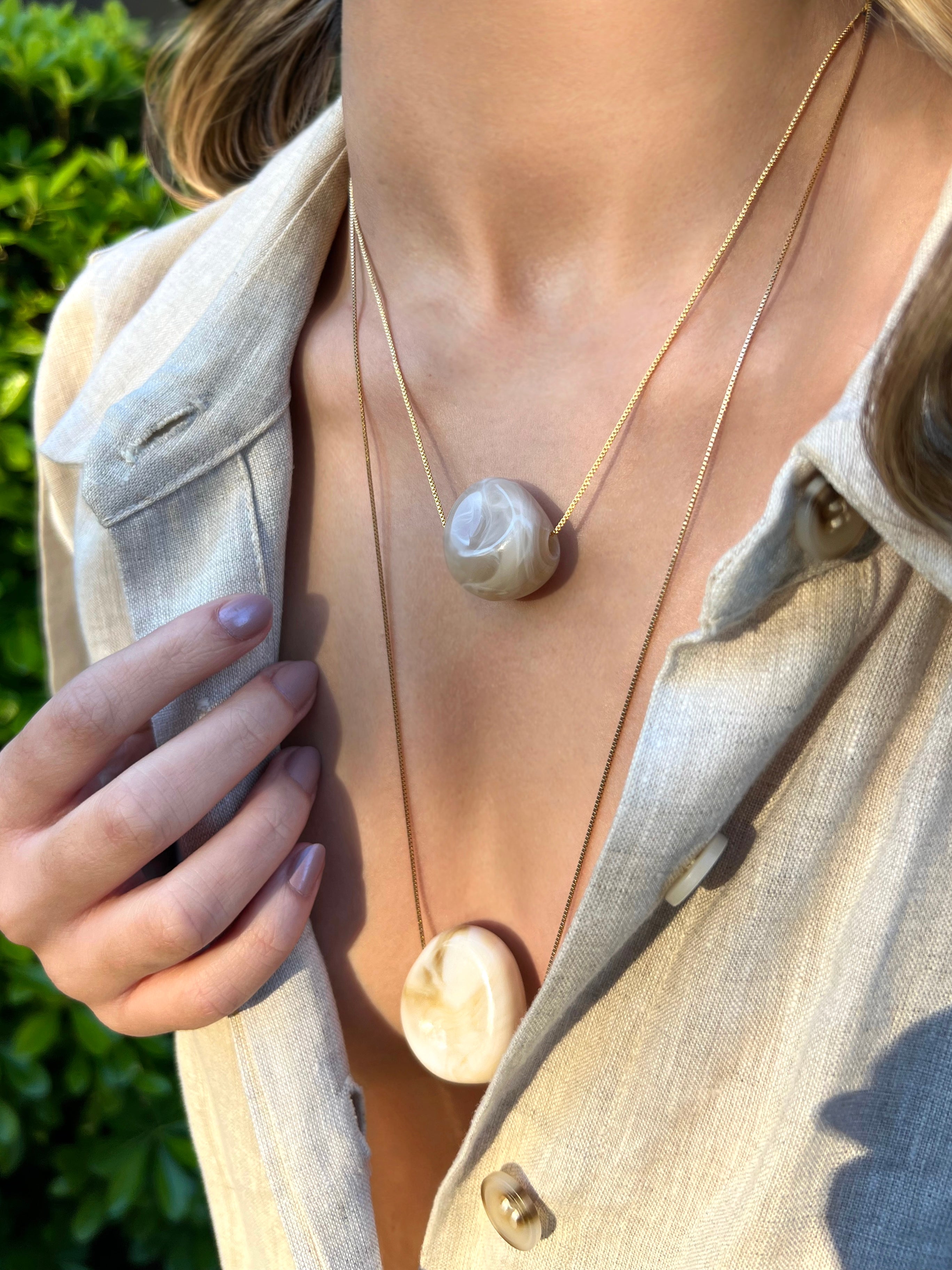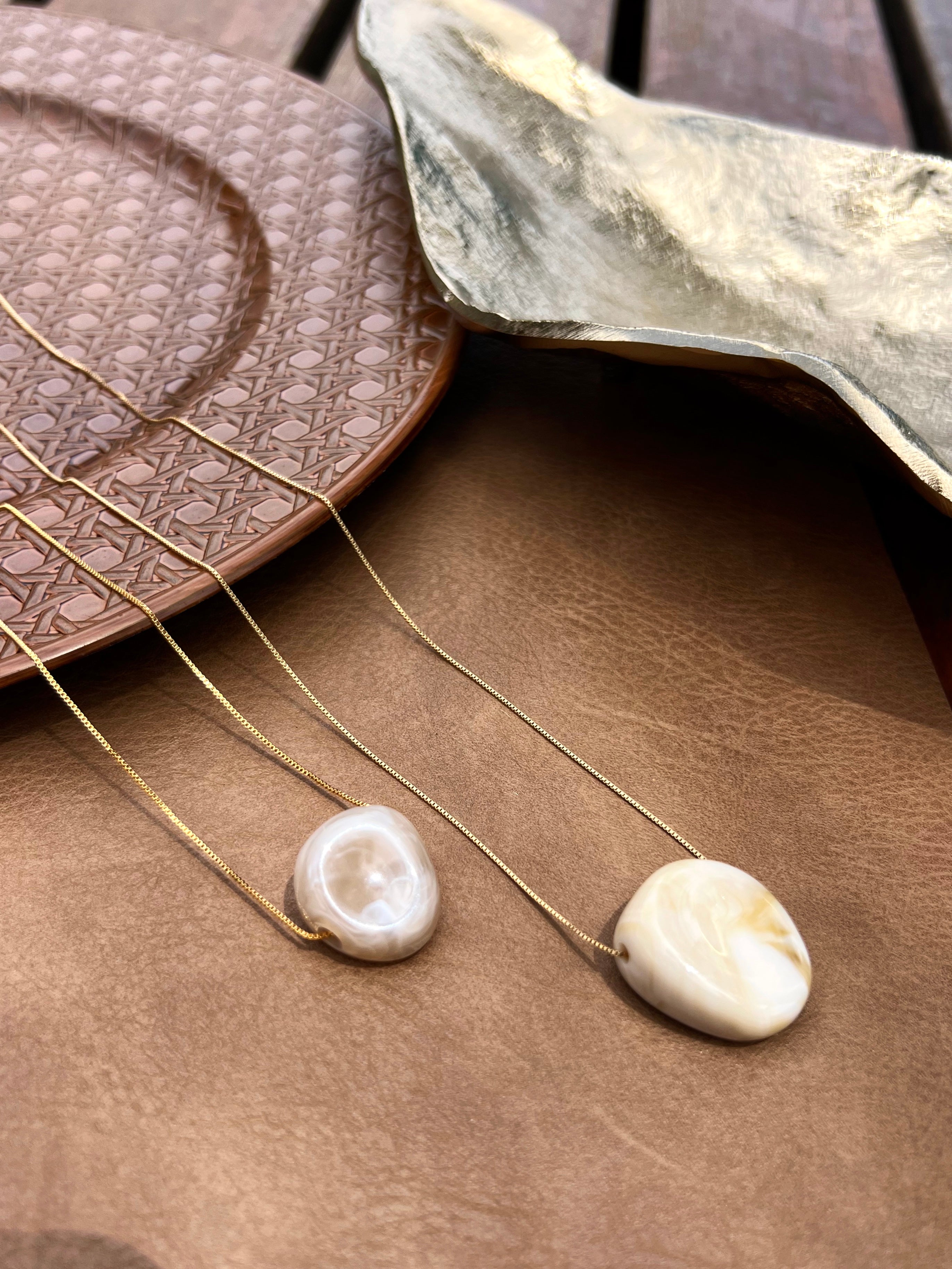 Mix De Dois Colares Corrente Veneziana Fina Com Pingente Resina Quartzo Bege e Marfim