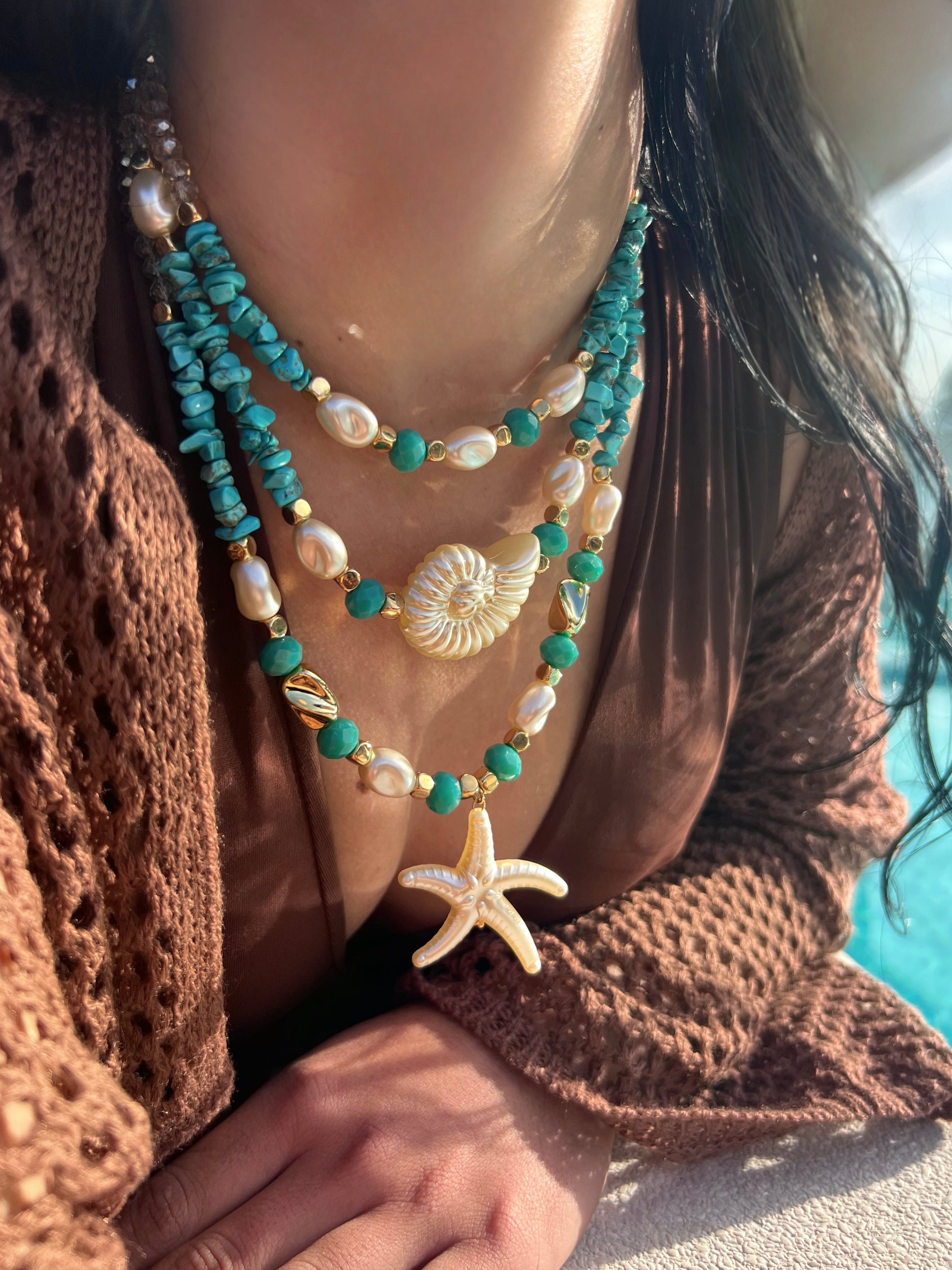 Este mix reúne nossos três colares com turquesa, pérolas acrílicas e detalhes dourados — uma combinação perfeita para criar camadas cheias de estilo, frescor e sofisticação.